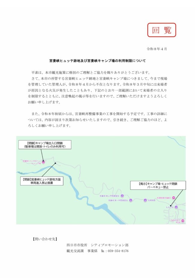 宮妻峡ヒュッテ跡地及びキャンプ場の利用制限について